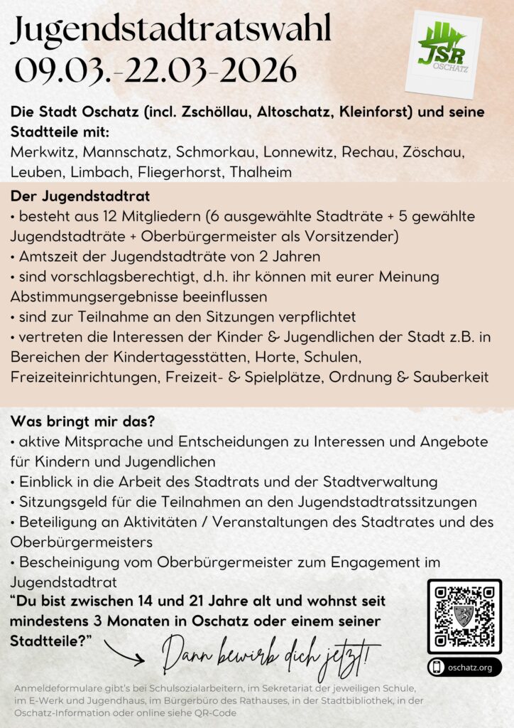 Interessenten können sich ab sofort und bis zum 26. Februar 2026 zur Wahl aufstellen lassen. Nutzt dafür bitte das untenstehende Anmeldeformular und gebt es entweder in eurer Schule oder im Bürgerbüro der Stadtverwaltung Oschatz ab.